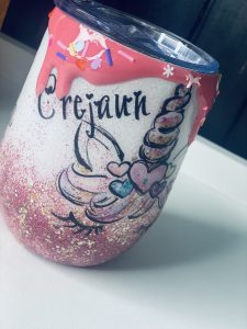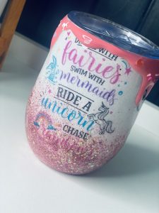 This magical tumbler is a 10 oz double insulated steel tumbler with a sealable lid it also has a 3 D drip at the rim of the tumbler.
