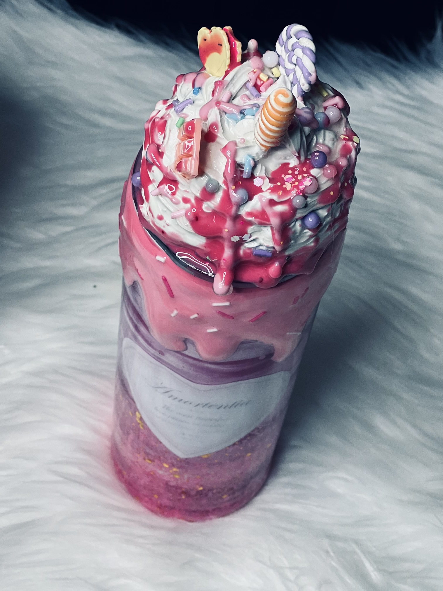 This tumbler comes with a faux cream lid and 3 D effects
