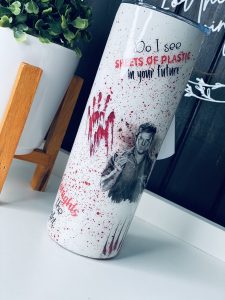Dexter fans! This is for you. Double insulated steel Tumbler keeps hot drinks hot and same with cold this is a 20 oz skinny tumbler with a leak proof lid.